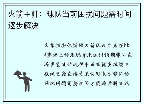 文章摘要:休斯顿火箭队近年来在NBA赛场上的表现并未达到预期,球队在逐步重建的过程中面临诸多挑战。主教练近期在接受采访时表示,球队的困扰问题需要时间才能逐步解决,这也揭示了当前火箭队所处的艰难时刻。本...