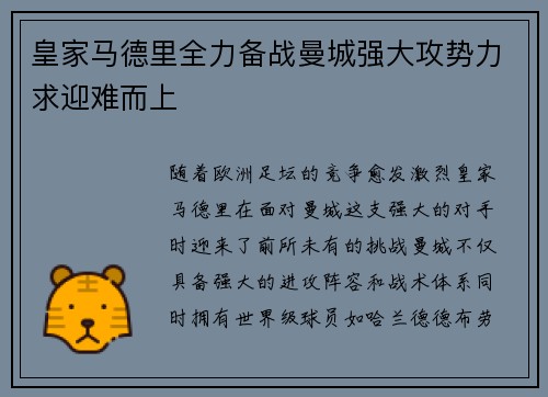 随着欧洲足坛的竞争愈发激烈,皇家马德里在面对曼城这支强大的对手时,迎来了前所未有的挑战。曼城不仅具备强大的进攻阵容和战术体系,同时拥有世界级球员如哈兰德、德布劳内等,这些都让他们的进攻成为欧洲足坛最具...